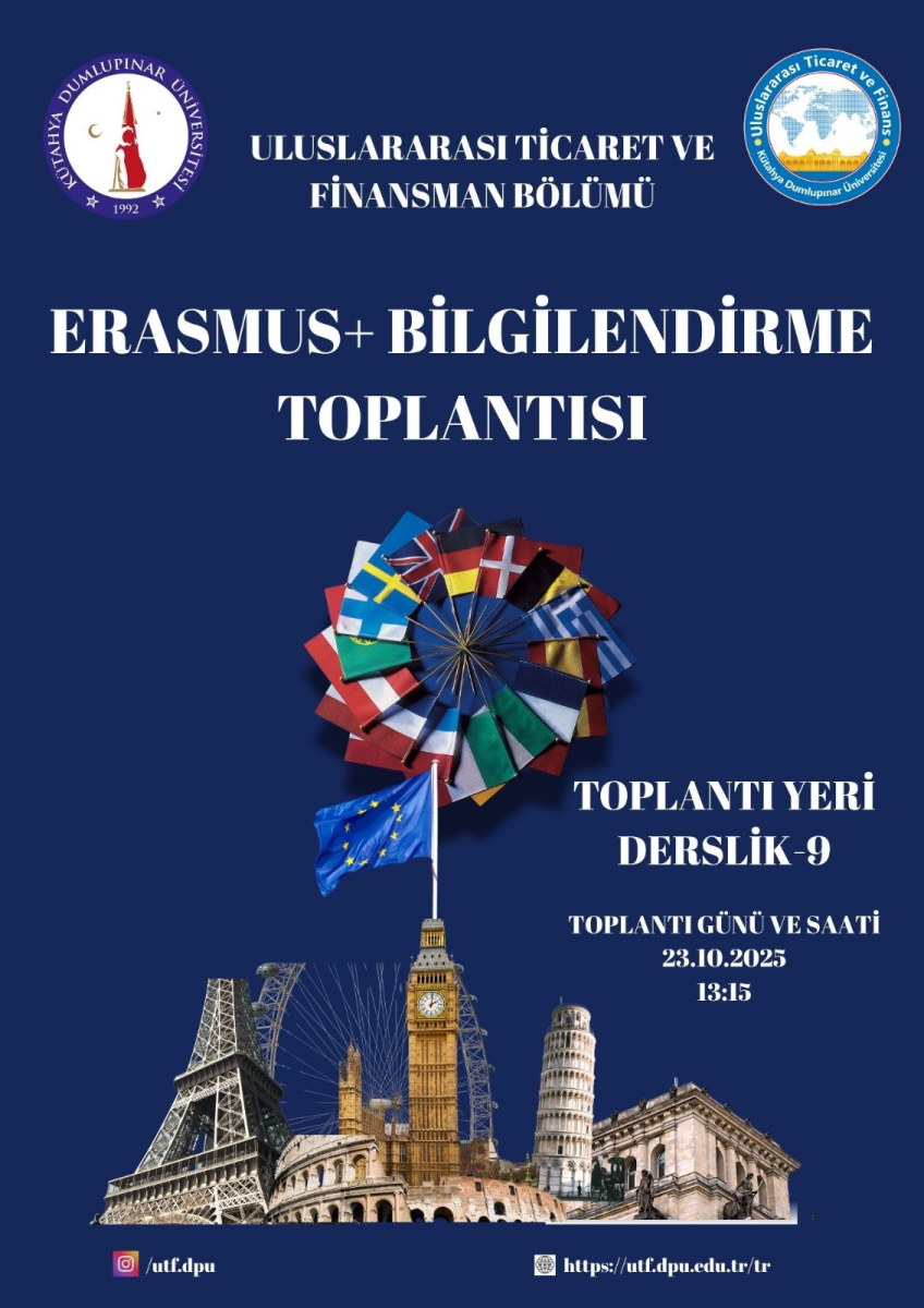 Uluslararası Ticaret ve Finansman Bölümü Erasmus+ Bilgilendirme Toplantısı 23.10.2025 Perşembe günü saat 13:15'te Derslik 9'da düzenlenecektir.